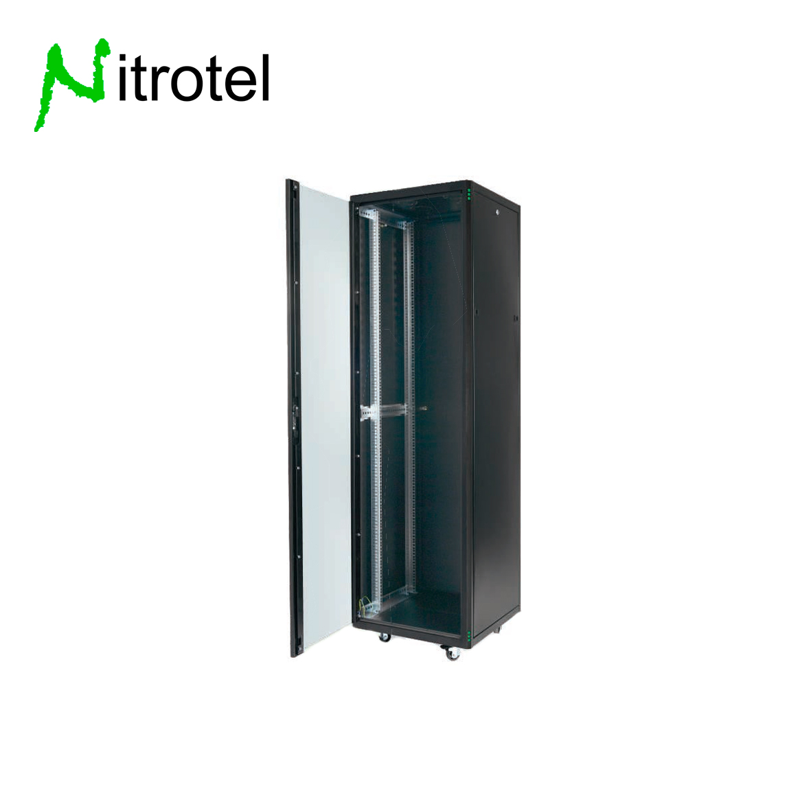 Puerta delantera reversible de vidrio templado y puerta trasera sólida simple con sistema de bloqueo de 3 puntos. Fabricada en acero resistente y terminada con pintura electrostática negra RAL 9005. Viene completa con niveladores de piso y kit de conexión a tierra.