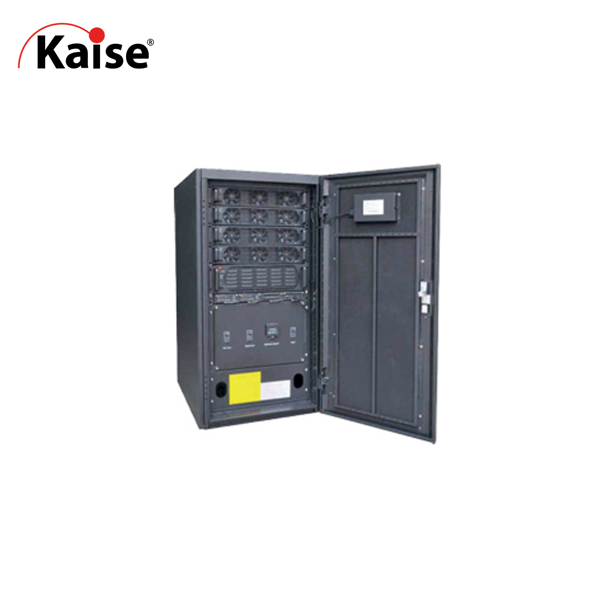 UPS KAISE modular 100KVA, estructura (frame) con entrada principal, salida de bypass y breaker de bypass manual, pantalla LCD, control de unidad.